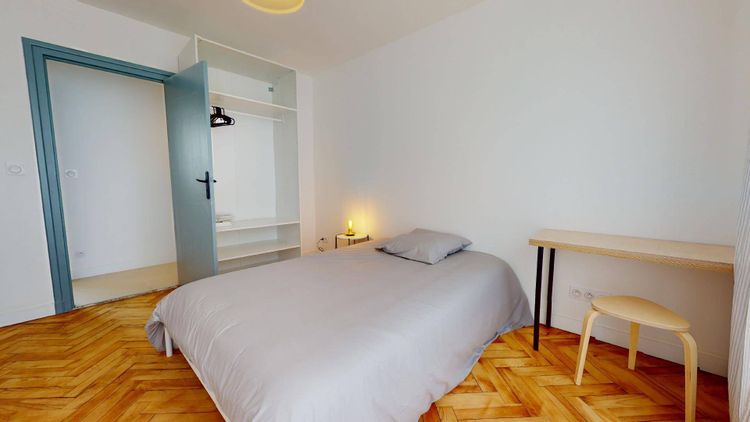 Cette chambre est équipée d'un lit double, bureau, espace de rangement + salle d'eau privative avec douche et meuble vasque. Charges incluses (eau, électricité, chauffage, internet)