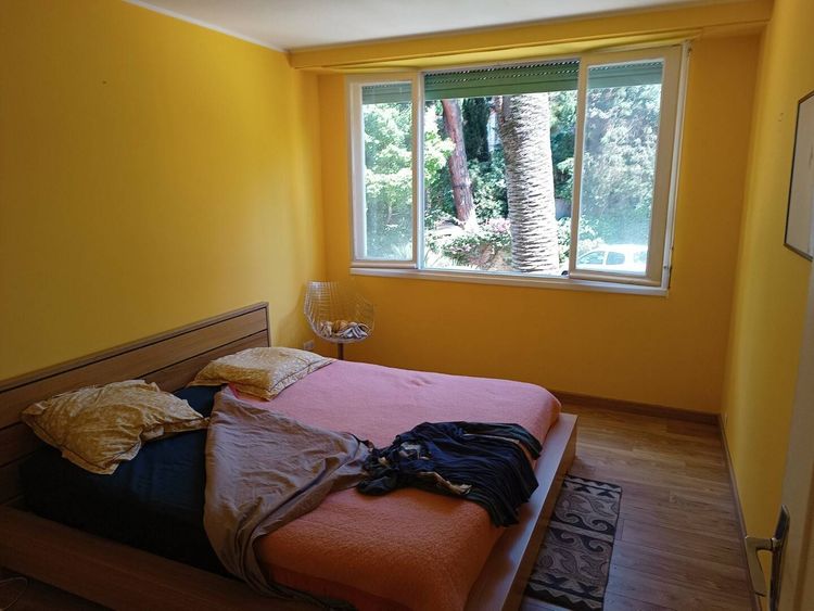 Grande chambre avec une belle vue sur un Jardin/Parking sans via à vis. Meublée avec un grand lit, un placard, une chaise. Un bureau et une armoire à livre en cours de montage (non visibles sur les photos)