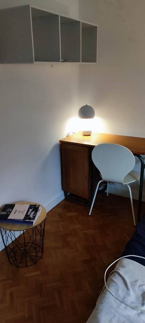 Chambre avec un lit 90, un grand placard et un bureau. Table de chevet et petit meuble d'appoint.
