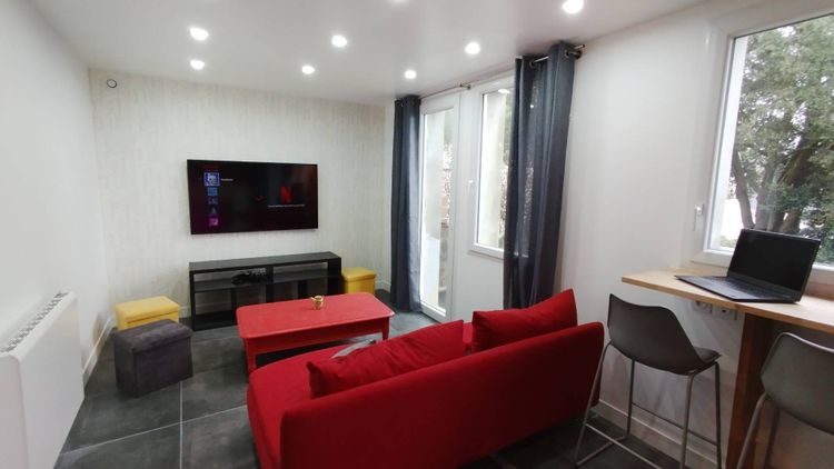 Au 1er etage Chambre de 8,5 m2 côté rue Lit 140 x 200 Dressing Salle de bain avec douche, meuble vasque et WC Espace bureau/ kitchen côté jardin avec mange debout, frigo, micro onde, evier et bouilloire