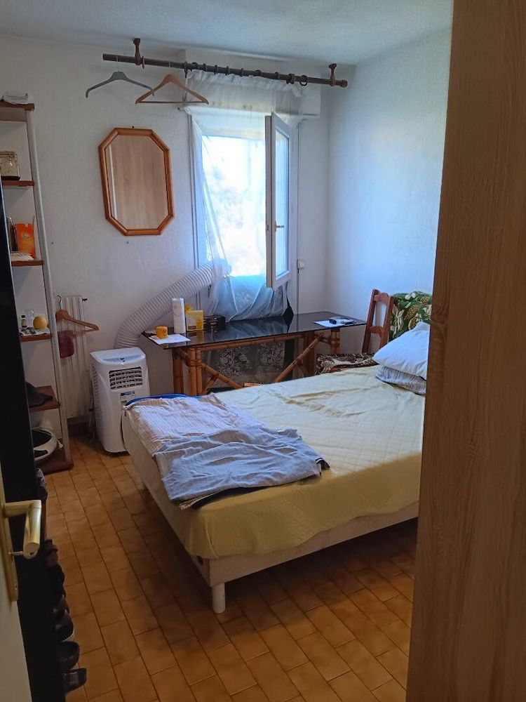Chambre atypique deuxième moitié de l ancienne salle à manger il y a l espace véranda et l espace literie entre les deux un volet roulant Un ventilateur au plafond Deux petits placard et deux grandes étagères avec dressing