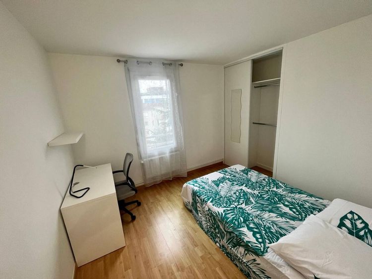 La chambre est équipée d'un lit en 120cm avec linge de lit et couette, un bureau avec chaise de bureau et lampe de bureau et un placard avec penderie.