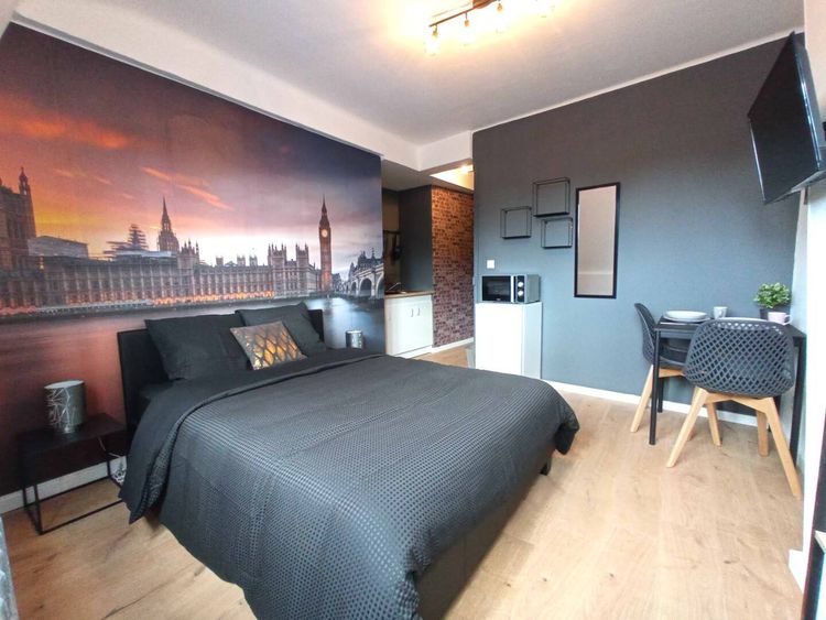 Chambre-Studio "Londres" de 19m² - chambre spacieuse, lumineuse et agréable, équipée d'un lit double, un espace repas, un bureau ainsi qu'une étagère de rangement. La chambre possède aussi sa propre kitchenette et salle de bain.