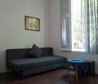 Salon aménagé en chambre avec la porte coulissante fermée à clé. Rangements ( photos joints), canapé-lit, table et chaise,.. La fenêtre oriente vers le Sud et la terrasse très agréable: aérée, ensoleillée et sans vis à vis.