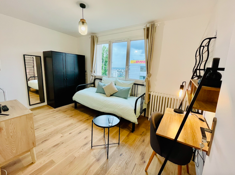 Chambre élégante et agréable, avec double fenêtres sans vis à vis. ( double vitrage) Mobilier neuf avec lit convertible. Beaucoup d'espace pour circuler dans cette chambre.