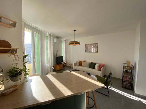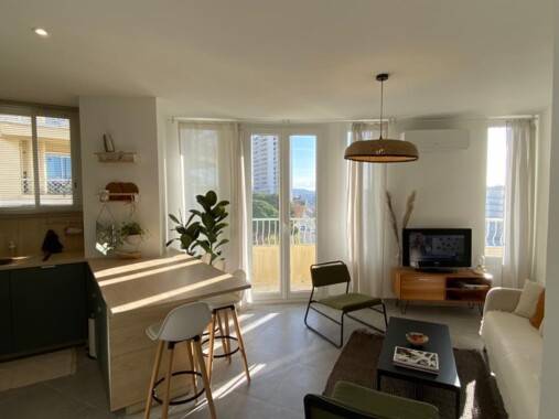 orientée Sud, équipée meublée, climatisée grande baie vitrée donnant sur balcon vue Mer et vue Chalucet porte à serrure individuelle séjour cuisine ouverte équipée commun 2 salles de bain WC suspendus communs