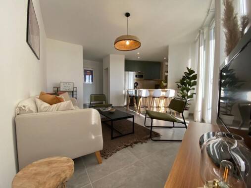 orientée Sud, équipée meublée, climatisée grande baie vitrée donnant sur balcon vue Mer porte à serrure individuelle séjour cuisine ouverte équipée commun 2 salles de bain WC suspendus communs