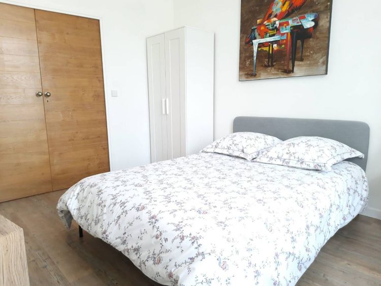* 2 chambres au total : - La chambre 1 (sur les photos) : au calme donnant sur cour est une chambre de 11 m² spacieuse qui dispose : d'un lit 2 places 140 cm × 190 cm, un bureau, une penderie intégrée, écran TV plat, linge de lit.