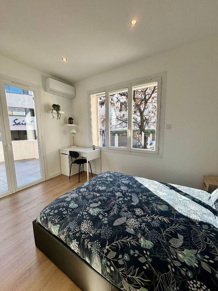 Cette grande et belle chambre est très spacieuse et décorée avec goût. L'espace de travail est composé d'un bureau et d'une chaise. Une armoire pour ranger ses affaires et des étagères sont également présentes dans l'appartement. La chambre donne directement accès à la terrasse Sud de l'appartement. La chambre ferme à clé et est équipée de la climatisation.
