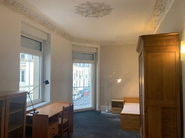 Charmante chambre spacieuse aux plafonds hauts et moulures d'origines. Lumineuse, éclairée par une grande fenêtre au double vitrage et volets roulants, elle donne sur une petite rue adjacente tres calme. Elle est fraîche en été, chaude en hiver chauffée au gaz par 1 corps de chauffe en fonte. Meublée d'un lit simple, un bureau et son fauteuil, une penderie , 1 table de chevet et une bibliothèque, elle a accès à un toilette sur le palier et à l'étage à une salle de bain pour 4 personnes.