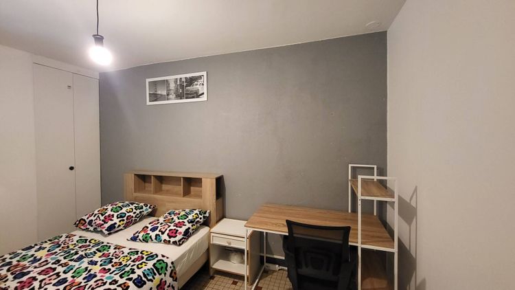 Chambre de 10 m2 refaite récemment, lumineuse avec lit 2 places, chevet, placard, bureau et chaise de bureau etc... Bref tout le nécessaire pour être confortable!