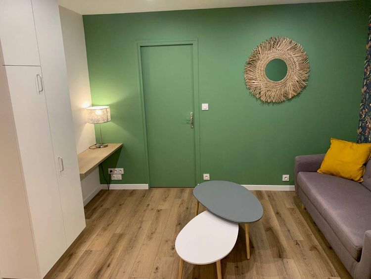 La chambre dispose d’un bureau et d’une chaise, un dressing, un lit avec un matelas neuf de 140x190 et de 21cm d’épaisseur, une parure complète (couette, draps, housses de couette, alèse), un grand miroir, une lampe de chevet, une serrure avec clé individuelle. La chambre est également calme grâce à sa fenêtre en double vitrage PVC et son volet électrique.