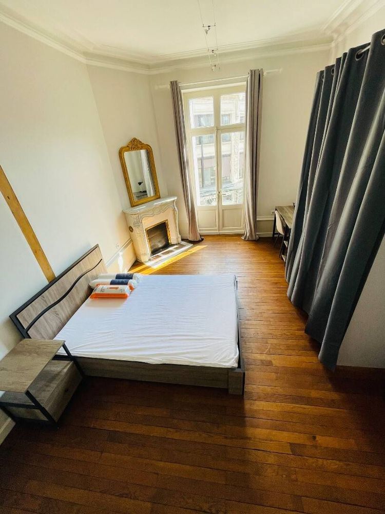 La chambre#5 de 18,05m2 lumineuse grâce avec ses grandes portes-fenêtres donnant sur son balcon, décorée avec son beau manteau de Cheminée accompagnée d’un miroir doré.