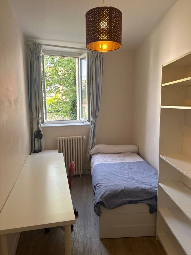 La chambre est calme, lumineuse. Table bureau et placard. La chambre donne sur le jardin