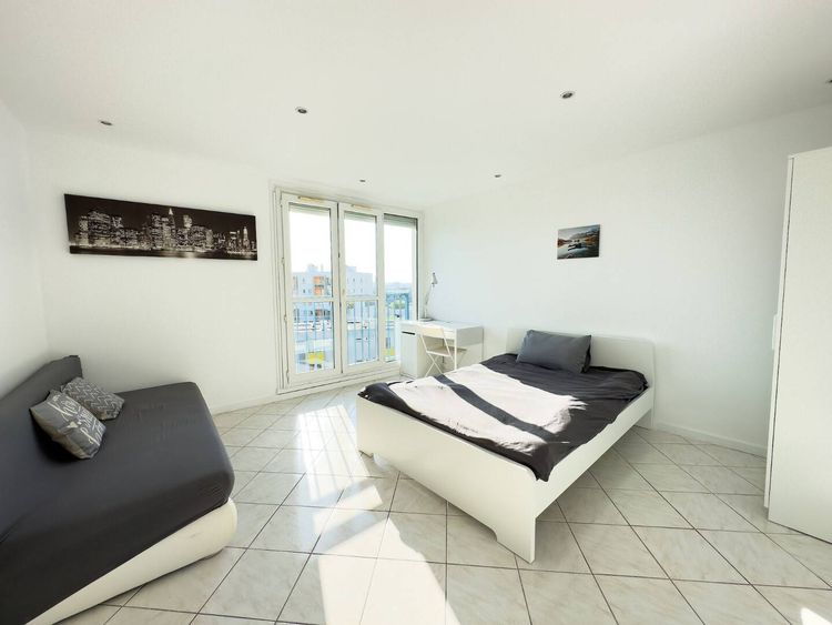 Chambre A Exposé plein nord. Chambre meublée avec lit double, canapé, bureau, chaise, armoire, couette, oreille, draps et housse sont fourni. Grande fenêtre avec double portes.