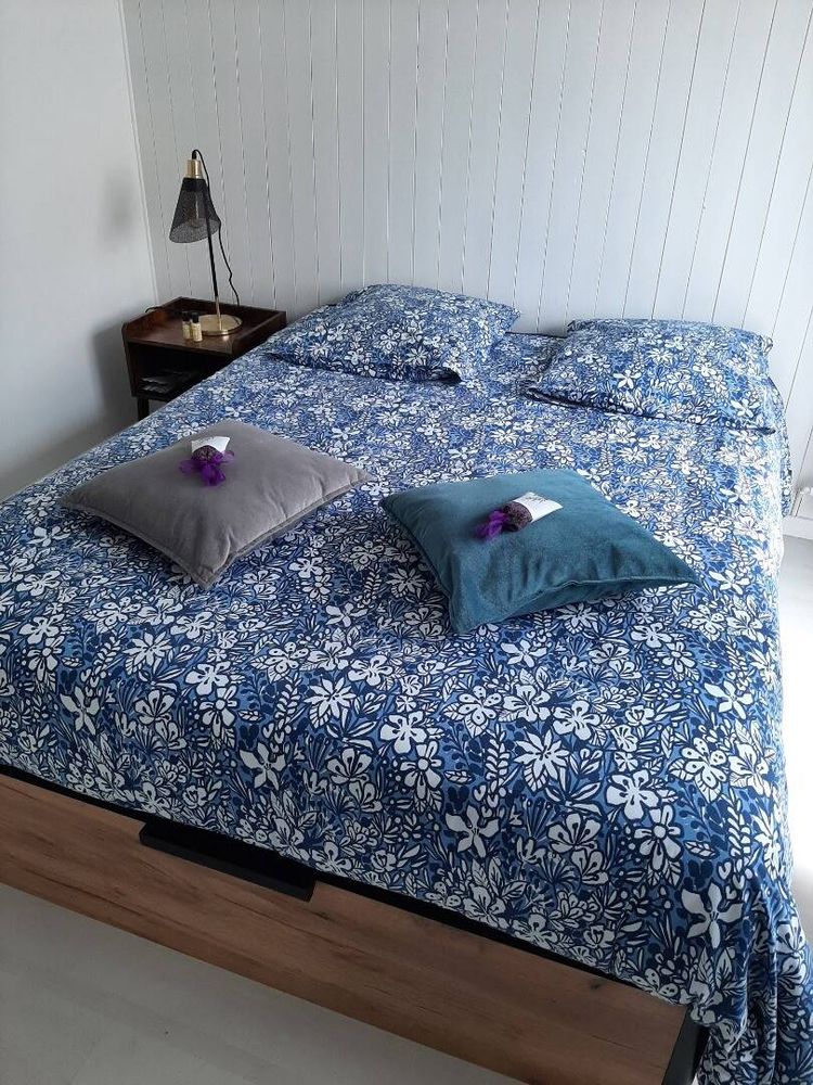 Chambre au calme avec lit-coffre en 140x190, coin bureau et accès balcon donnant sur un jardin d'agrément avec palmier et sapin. Grand placard mural privatif dans le couloir avec étagères et rangements.