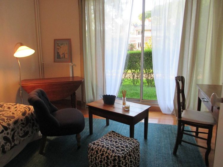 Chambre avec jardinet privé. Très calme équipée avec un lit d'une personne, une table et une chaise de travail, une penderie, une bibliothèque, une table basse et un fauteuil.
