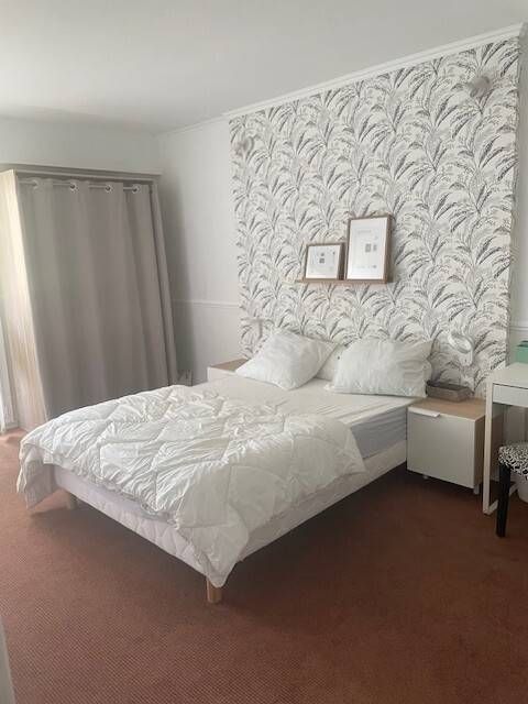 chambre avec lit bureau chaise tv etagères dressing tete de lit avec elctricité sortie direct sur balcon traversant