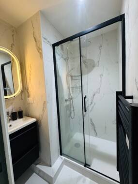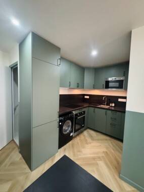 - Cuisine entièrement équipée : four, hotte, micro-ondes, plaques à induction, grand frigo + congélateur, vaisselle complète, table coin repas.