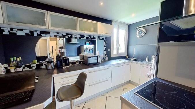 Ensuite, une cuisine semi-ouverte sur le salon se découvre. Elle est très bien équipée avec son four, son micro-onde, ses plaques de cuisson, sa hotte, son frigidaire, et ses nombreux rangements.
