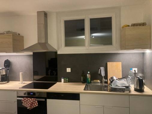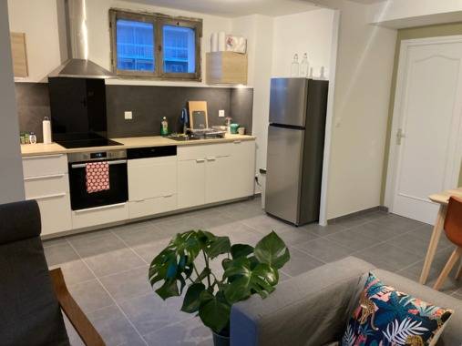 Pièce de vie avec cuisine ouverte complétement équipée (four, plaque, micro-onde, frigo, lave-vaiselle, lave-linge).