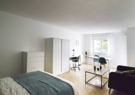 Cette belle chambre de 25m² est louée tout équipée et entièrement meublée en plein cœur de Grenoble. Cette chambre comprend un confortable lit double (140x190), une table et une lampe de chevet. Elle dispose également d’un très bel espace de travail avec un bureau, une chaise et une lampe, de multiples rangements et une penderie pour y ranger toutes vos affaires, et d’un beau balcon. L’appartement dispose d’une salle de bain avec douche et machine à laver/sèche-linge, et un WC indépendant. Colivys met à votre disposition tous les équipements ménagers dont vous avez besoin (serpillière, balai, aspirateur). Nous avons opté pour une décoration foncièrement sobre afin de permettre à ses locataires d’en disposer comme ils le souhaitent, en y ajoutant leurs objets personnels pour se sentir chez eux. Situé dans une résidence calme, l’appartement bénéficie des serrures connectées sécurisées. Il a aussi une proximité des commerces et des restaurants. La résidence propose de multiples places de parking à louer, parfait si vous êtes propriétaire d’une voiture. Toutes les charges locatives sont incluses dans votre loyer : eau, électricité, gaz, internet et assurance habitation. Et n’oubliez pas, chaque chambre du logement est éligible aux APL, selon les conditions de la CAF.