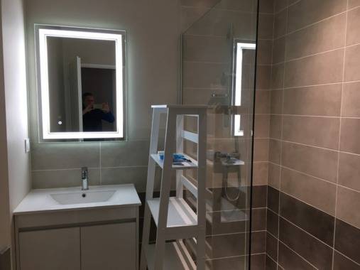 Chambre au rez de chaussée de 16 m2 avec salle d 'eau privative. Toute équipée : Lit 140 x 200 cm Grand dressing avec porte vitrée espace bureau Rangement Grande fenêtre / volet roulant Très ensoleillée