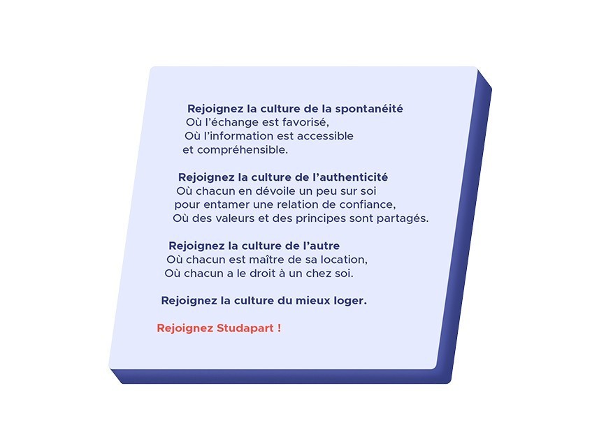 Nous espérons que Studapart puisse devenir un espace où les gens se sentent bien dans leurs locations. Un espace où nos utilisateurs partagent un état d’esprit qui les rassemble autour de valeurs communes de respect, de communication et de vivre-ensemble. Cet état d’esprit, c’est notre nouvelle signature : la culture du mieux loger.