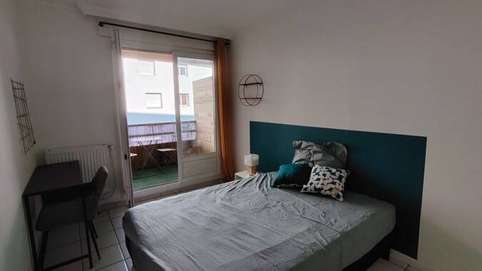 Chambre avec balcon privatif, un lit double, un bureau et un placard pour ranger les vêtement. La chambre lumineuse avec double porte fenêtre vitrée donnant sur le balcon.