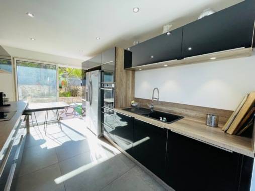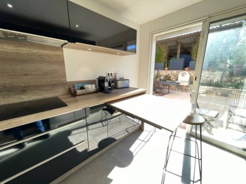 Cuisine contemporaine ouverte sur séjour et terrasse.