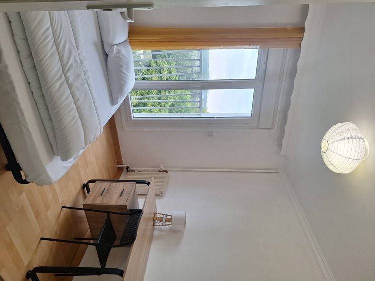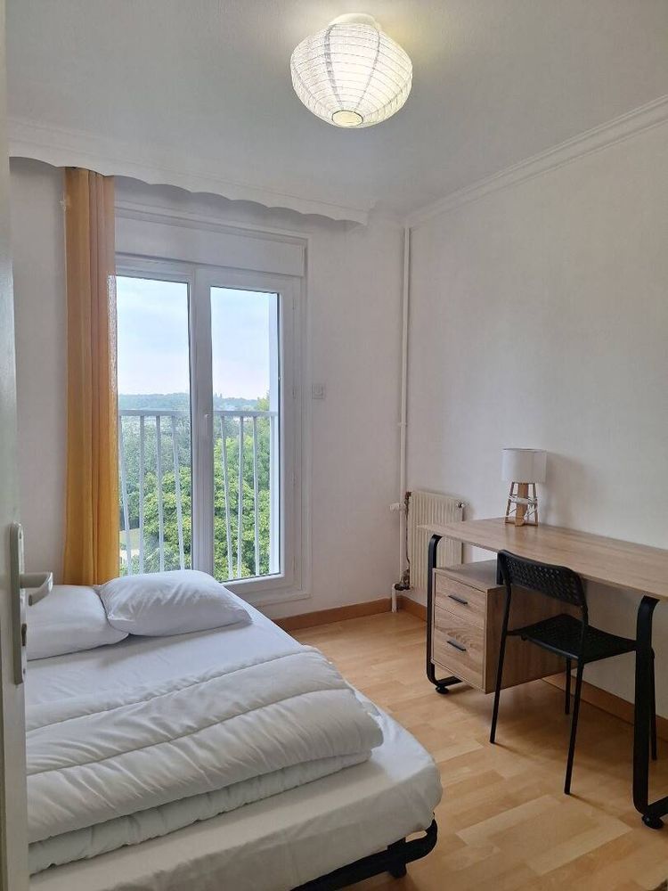 Chambre de 9 m² avec lit simple, grande armoire, bureau et chaise, parfaitement optimisée. Vue dégagée sur le parc, lumineuse et agréable au quotidien.