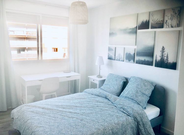 Chambre tout confort équipée d'un bureau moderne, armoire 3 portes, lampe de chevet, décoration soignée