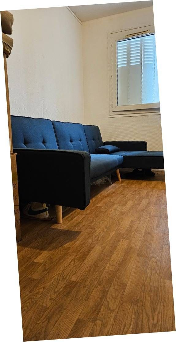 Chambre spacieuse et équipée d'un récent canapé convertible bleu Possibilité de visite