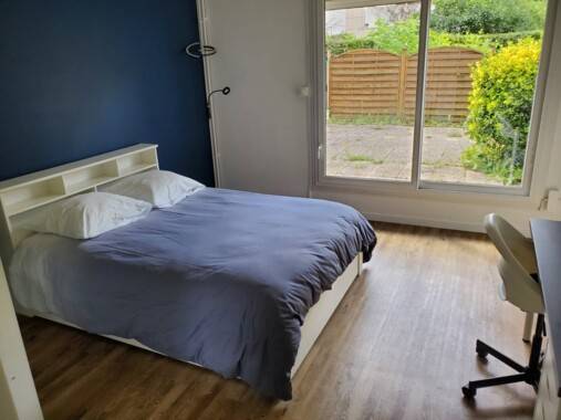 La chambre se compose d'un lit double avec tiroirs de lits, d'un bureau, d'une armoire à dressing et d'une baie vitrée ouvrant sur une large terrasse commune avec une autre chambre, mais accessible à tous les colocataires par un portillon extérieur. Elle est située au RDC de l'appartement, exposée sud, sans vis à vis.
