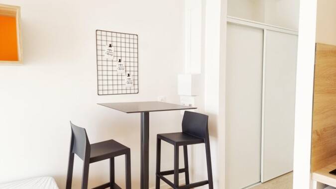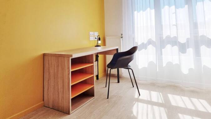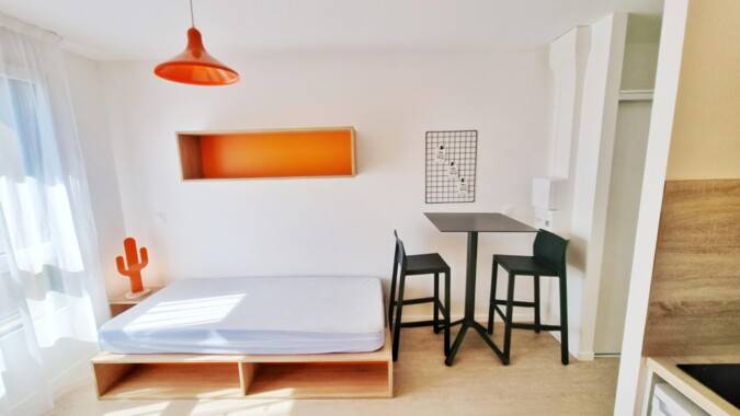 colocation au T2 entièrement meublés et équipés : - Kitchenette avec plaques électriques, frigo, four micro ondes, kit vaisselle, kit ménage, lit avec couette, rangements, table, bureau, chaise, salle de douche avec WC. Nombreux Services INCLUS dans le loyer : Petit déjeuner du lundi au vendredi en Cafeteria Salle de fitness Internet illimité Ménage du logement 2 fois par mois Réception de colis BIG BROTHER sur place Vidéosurveillance Accès sécurisé Local Vélos Salle de détente Salle de coworking Laverie sur place (abonnement illimité en sus)