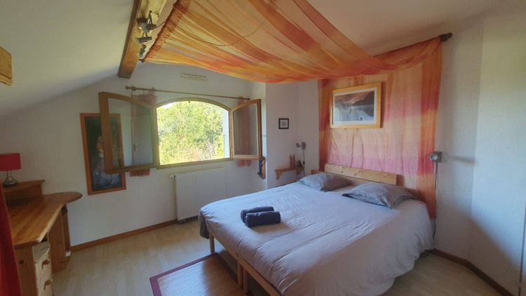 Chambre Bleue Lupin (14 m²) en colocation – Appartement à Choisy, 74 Située au 1er étage d’une villa à la campagne, cette chambre spacieuse de 14 m² offre un cadre calme. Elle est équipée d’un lit double (180 cm) ou de 2 lits simples, avec couette et oreillers. La chambre dispose également d’étagères, d’une penderie, d’un bureau et d’une chaise pour plus de confort et de rangement. L’appartement comprend 3 chambres en colocation, dont la troisième peut accueillir des personnes en séjour court à moyen terme ou ma fille pendant les vacances. Parties communes : L’appartement de 65 m² comprend une entrée indépendante, une cuisine équipée (lave-vaisselle, frigo/congélateur, four…), une salle à manger, une grande salle de bain, 2 WC, une buanderie, TV et Wifi. Important : Un véhicule est nécessaire, aucun transport en commun à proximité.