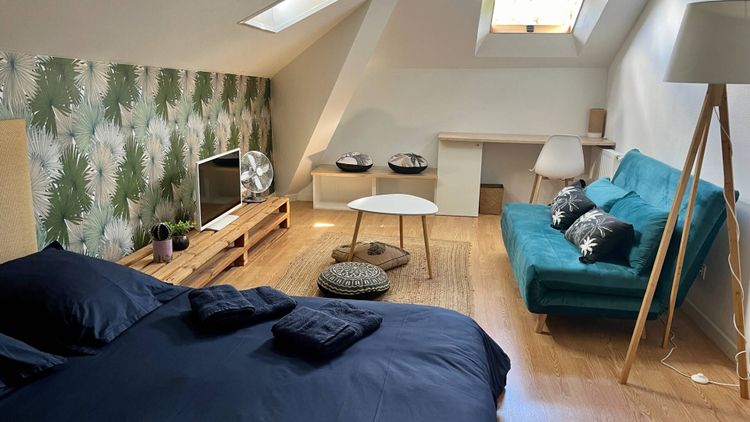 Moderne, pratique et pleine de charme, cette chambre allie style et fonctionnalité : - Lit double - espace bureau, - dressing intégré - et coin salon avec TV et canapé Un espace parfait pour une jeune femme active ou stagiaire longue durée recherchant indépendance et convivialité dans un cadre calme et soigné. 🛏 Comme un mini studio, clé en main.