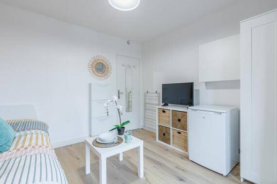 Une belle chambre de 11m2 dans un appartement entièrement renouvelé de 98m2, avec 6 chambres en total. La chambre est équipée de tout confort (lit banquette pour deux, bureau&chaise pour le télétravail, frigo, rangements, télé&casque ect)... et en plus il y a un accès au loggia.