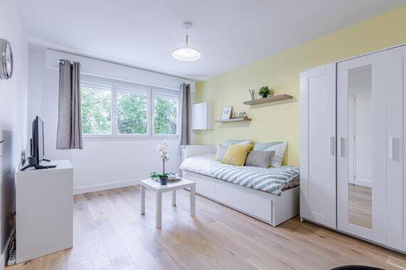 Une belle chambre de 14m2 dans un appartement entièrement renouvelé de 98m2, avec 6 chambres en total. La chambre est équipée de tout confort (lit banquette pour deux, bureau&chaise pour le télétravail, frigo, rangements, télé&casque ect)...