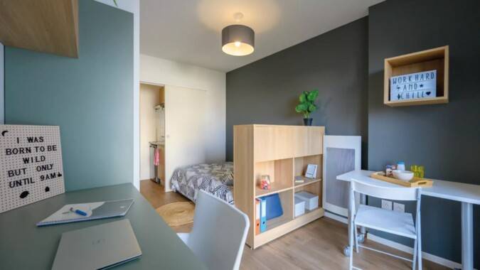 Au cœur du quartier des arènes, à proximité des plus grandes écoles, la résidence Student arena vous propose des logements du studio au T2. Les appartements sont composés d’un coin cuisine équipé avec rangements, de plaques de cuisson électriques, four micro-ondes, réfrigérateur. D’une salle d’eau avec douche et WC ainsi qu’une pièce à vivre avec un lit 120, penderie, table, chaises, bureau et étagères murales, prise TV et connexion internet.