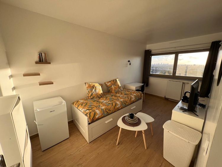 Chambre d'environ 12,17 m² comporte : - Un lit gigogne allant jusqu'à 160*200 cm avec matelas et linge de lit neuf. - Un bureau avec chaise - Armoire 3 portes avec miroir - Rangement supplémentaire - 2 tables basses - TV Smart + casque Bluetooth - Réfrigérateur individuel