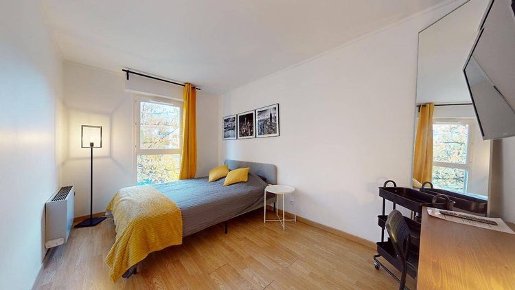 Cette chambre est équipée d'un lit double, d'un chevet, d'un bureau, d'une chaise, d'une télévision murale et d'un grand placard de rangement intégré.