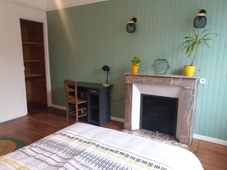 Chambre lumineuse au premier étage, avec parquet et ancienne cheminée en faces de la salle de bain, avec lit, table de nuit, bureau, chaise, lampe et placard encastré.