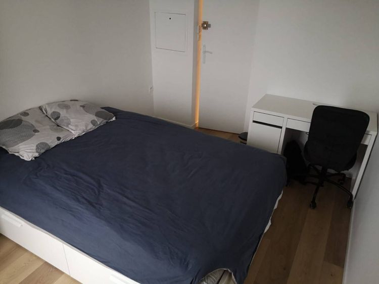 Chambre avec balcon, lit 2 places (rangements en dessous), bureau, armoire, draps, couette, oreiller.
