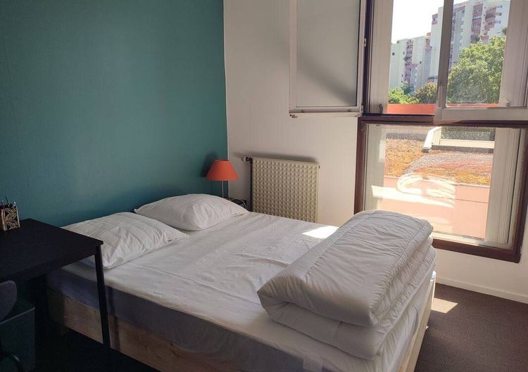 Chambre au premier étage du triplex. Une porte isole cet étage des espaces communs et le transforme en studio cosy : 2 chambres, toilettes et salle de bain. La chambre dispose d'une vue sur le parc Jean Verlhac, d'un lit double, bureau, table de chevet et d'un grand espace de rangement.