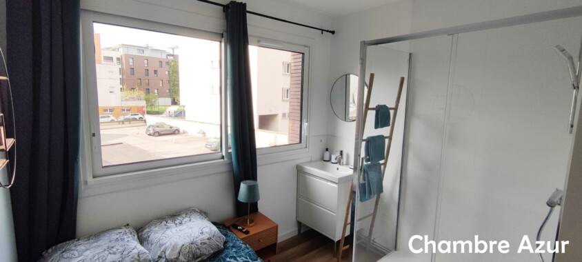 Chambre « Azur » de 10,8m2, avec salle d’eau privative comprenant douche 120x80 et meuble vasque, grand lit 120x190 avec matelas haute densité, lampe de chevet, dressing, TV connectée 24 pouces, bureau avec chaise, chauffage au sol, volets, rideaux occultants.