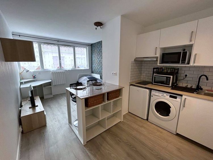 Studio lumineux, entièrement meublé et équipé : vaisselle, four micro-ondes, frigo top avec petit congélateur, plaque vitro céramique, hotte, table haute et tabourets, bureau, chaise de bureau, lave-linge, fer et planche à repasser.