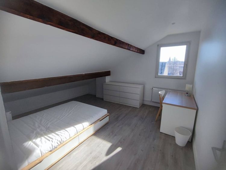 Maison refaite à neuf. Toutes les chambres disposent de rangements, d'un lit double, d'un bureau et d'un accès RJ45 à la fibre. Les charges comprennent notamment le chauffage, l'électricité, l'eau courante et la fibre. Lit double avec rangement intégré, commodes, bureau, chaise. Orientation sud avec store.
