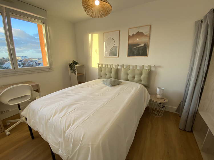 Elle est décorée avec goût, composée d'un lit 140*190 cm, 2 oreillers 90*90 cm, 1 couette, 1 bureau, 1 chaise, 1 lampe, 1 dressing