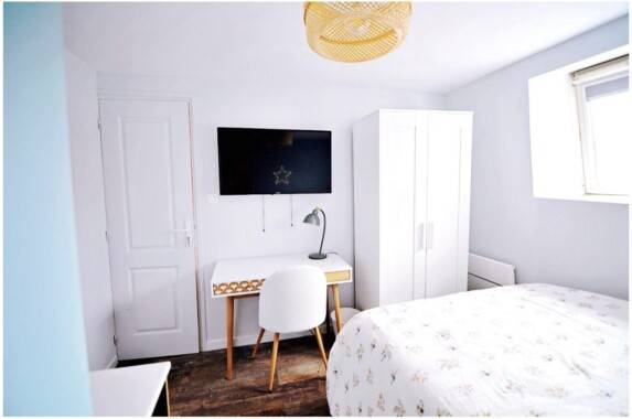 Chambre avec douche privée, une TV 4K internet inclus, un bureau, un placard.
